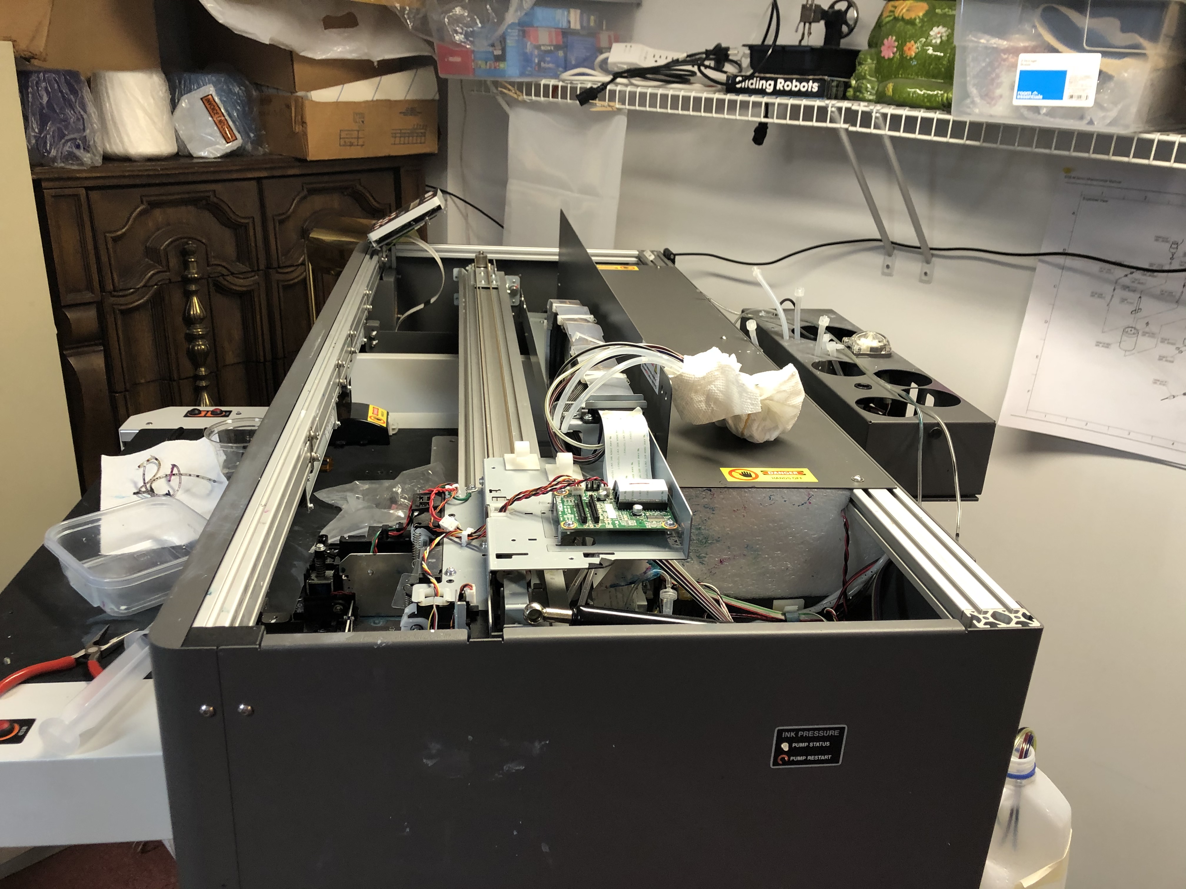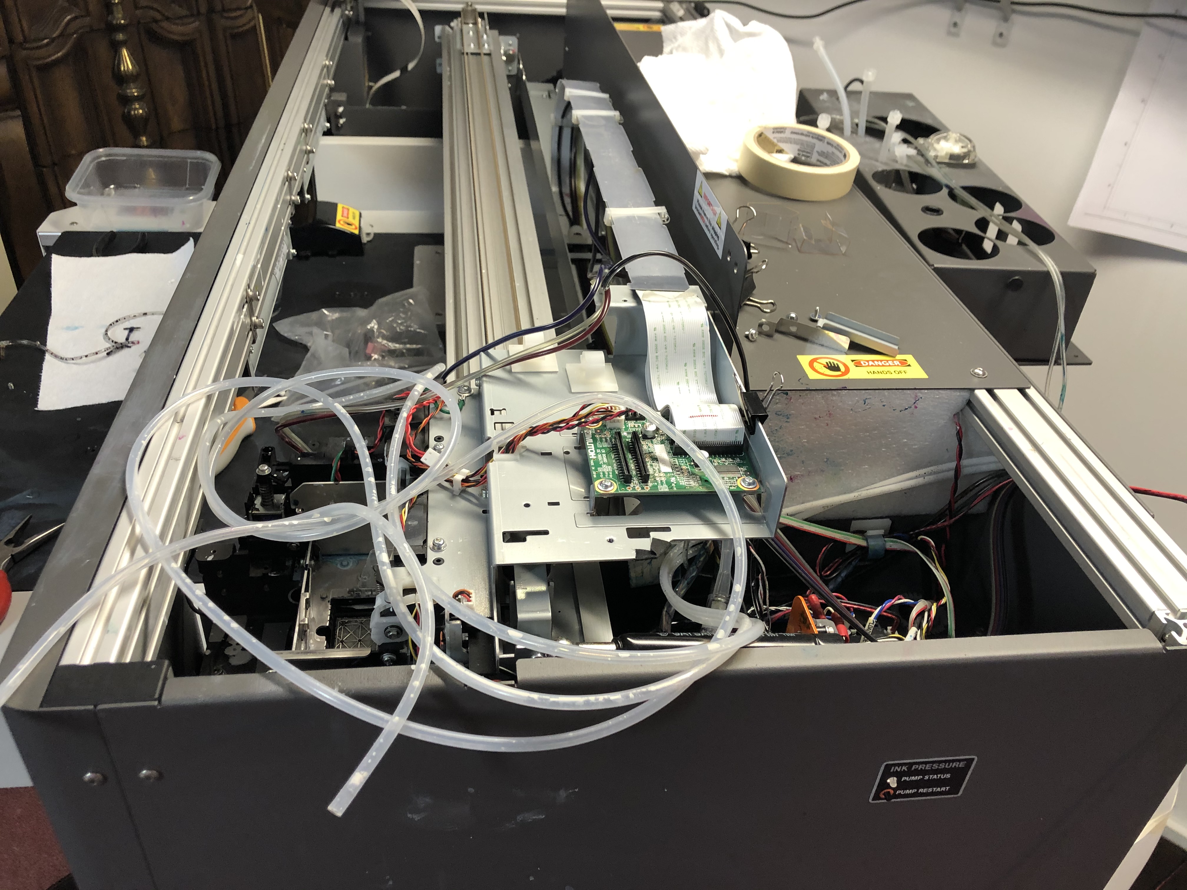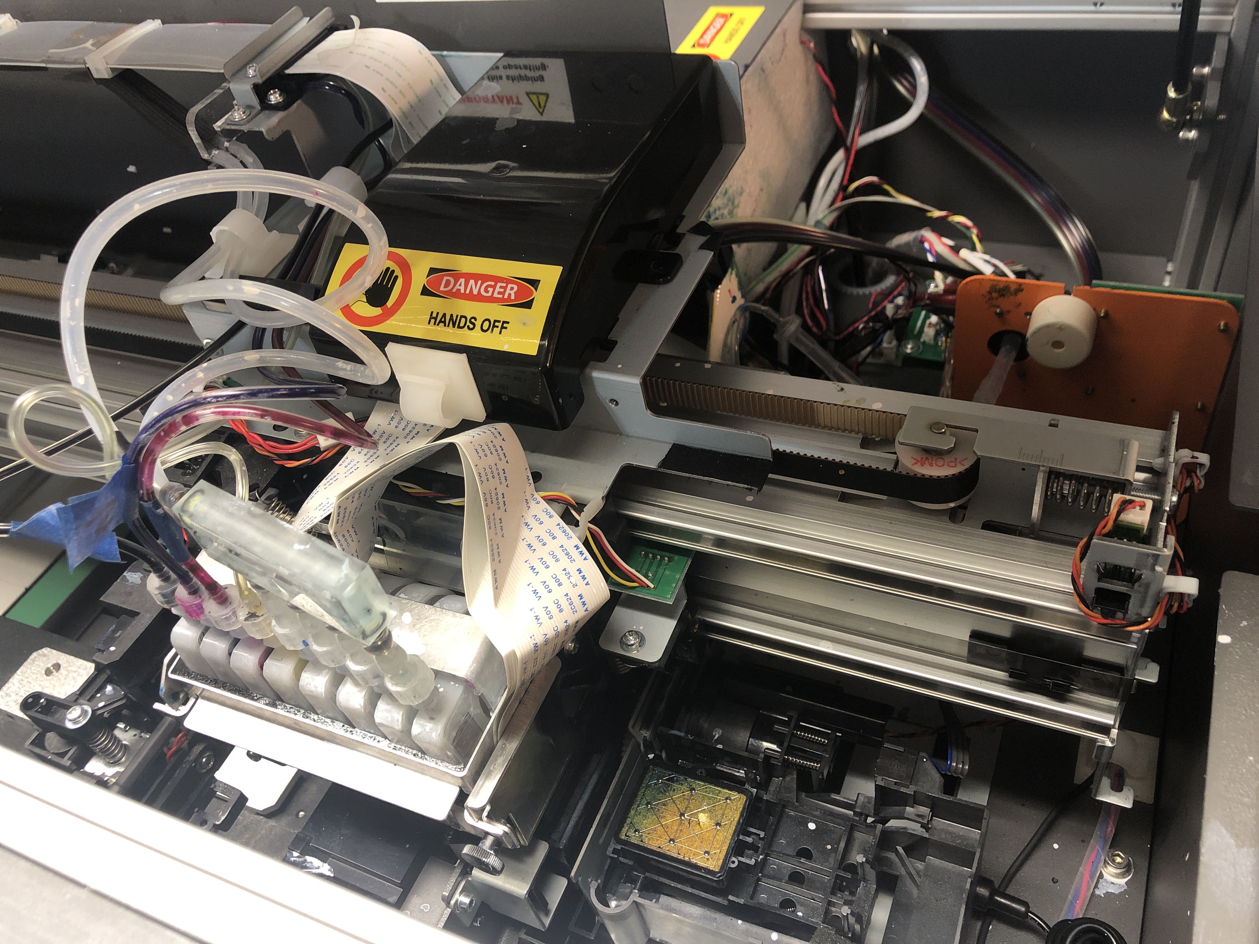 Ok before I start going on a rant. When I first found this machine it was kind of dead, “not working.” So i did a total rebuild, lucky me the all the boards, pumps and motors where ok. The ink lines, print head, and pump line where all clogged like my arteries if i don’t stop eating taco bell. Part where easy to get, from different ink dealers. But hidden secret just goto a local medical supply store and you can find most parts you’ll need. Also if you have a 3D printer, you can make your own and save more…. but i’m not that frugal.
